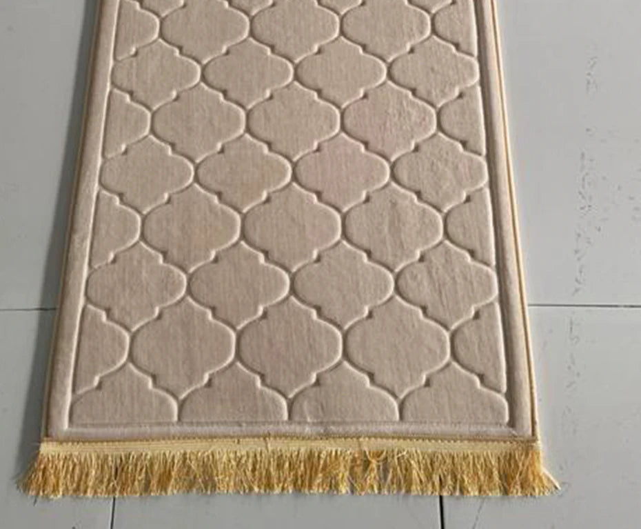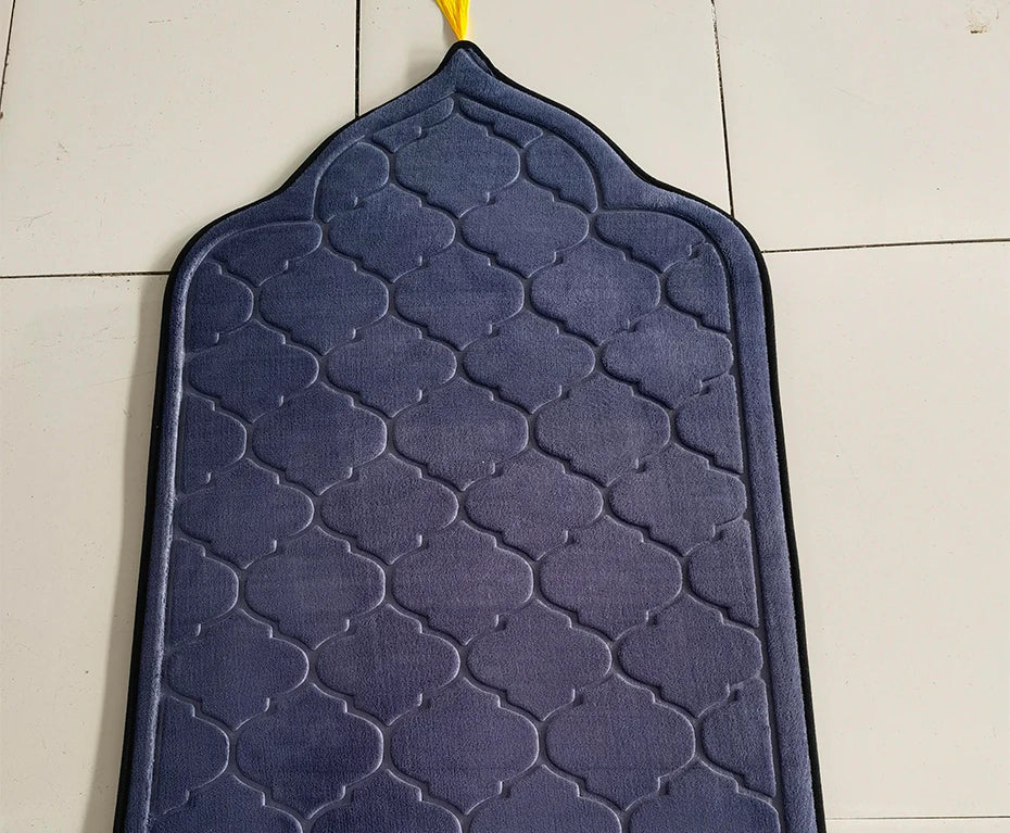 Utför dina dagliga böner med komfort och stil på denna muslimska bönematta i mjuk flanell. Den embossade designen och anti-slip-baksidan gör att mattan ligger stadigt på golvet, perfekt för hem, hotell, resor eller utomhusbruk.